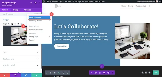 Using the Divi visual builder, you can add an Image Module (or use an existing one from a prebuilt template) to any WordPress page. In the Image Module Settings panel, click the “AI” icon and then “Generate with AI.”